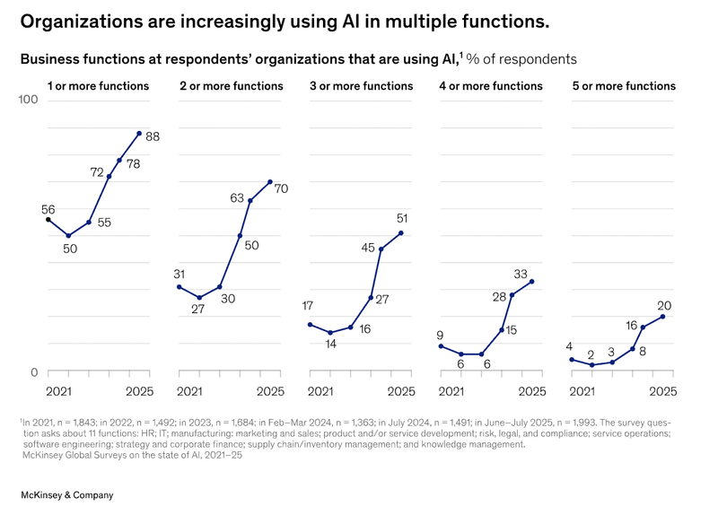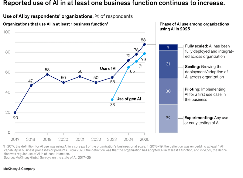 AI is everywhere — 88% of organizations now use AI in at least one business function, up from just 20% in 2017.